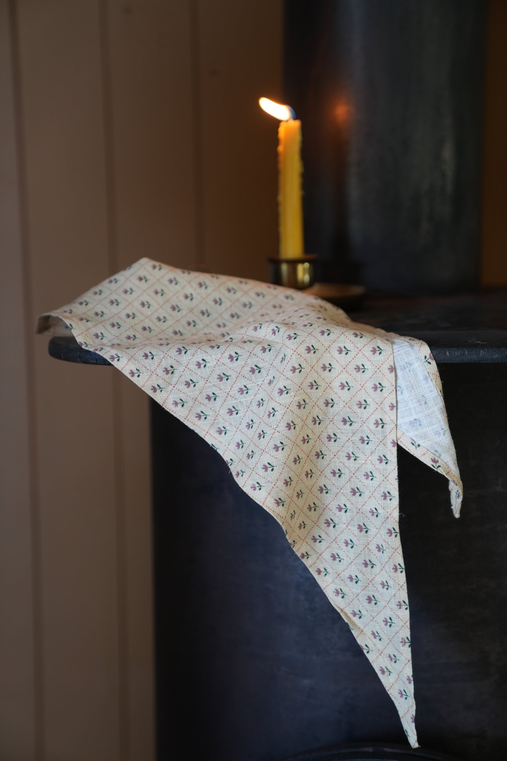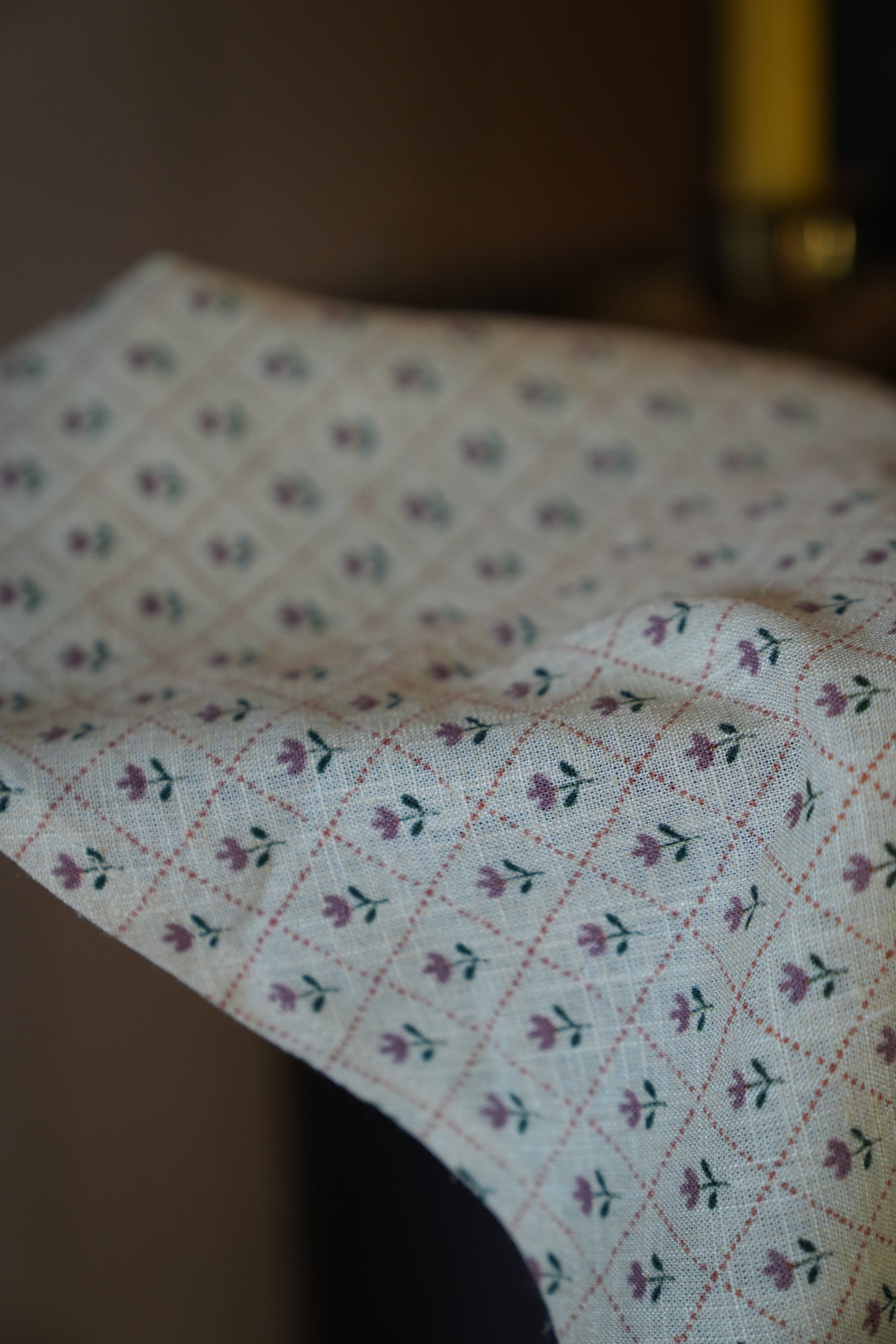 A little piece of comfort to tie your hair back, or drape around your neck while tending to the day’s gentle rhythm. The Hearth Kerchief is made from a soft linen with a dainty posy check print. Tiny mauve flowers framed within an old-fashioned grid, reminiscent of vintage ticking cloth and kitchen linens from simpler times.