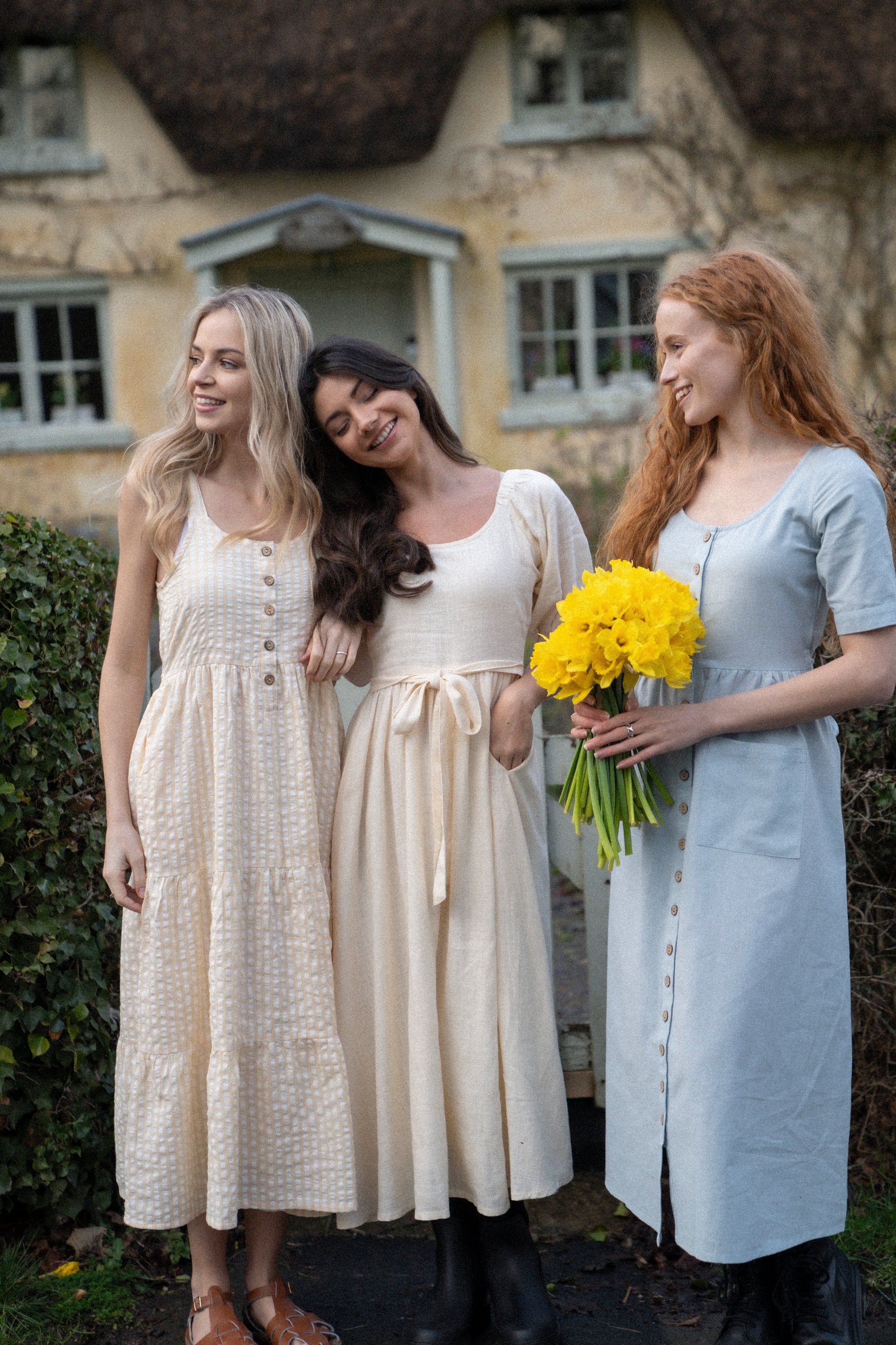 You may notice that the measurements for our sleeveless dresses appear slightly smaller than those of our sleeved styles. This isn’t a sizing difference — it’s simply a difference in fit.