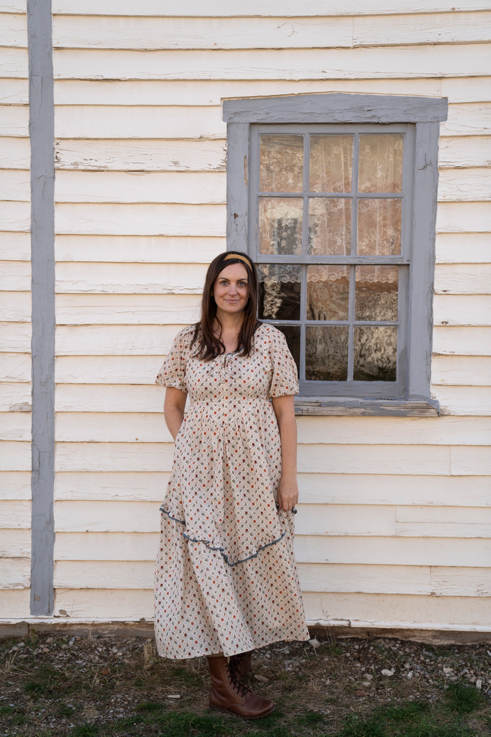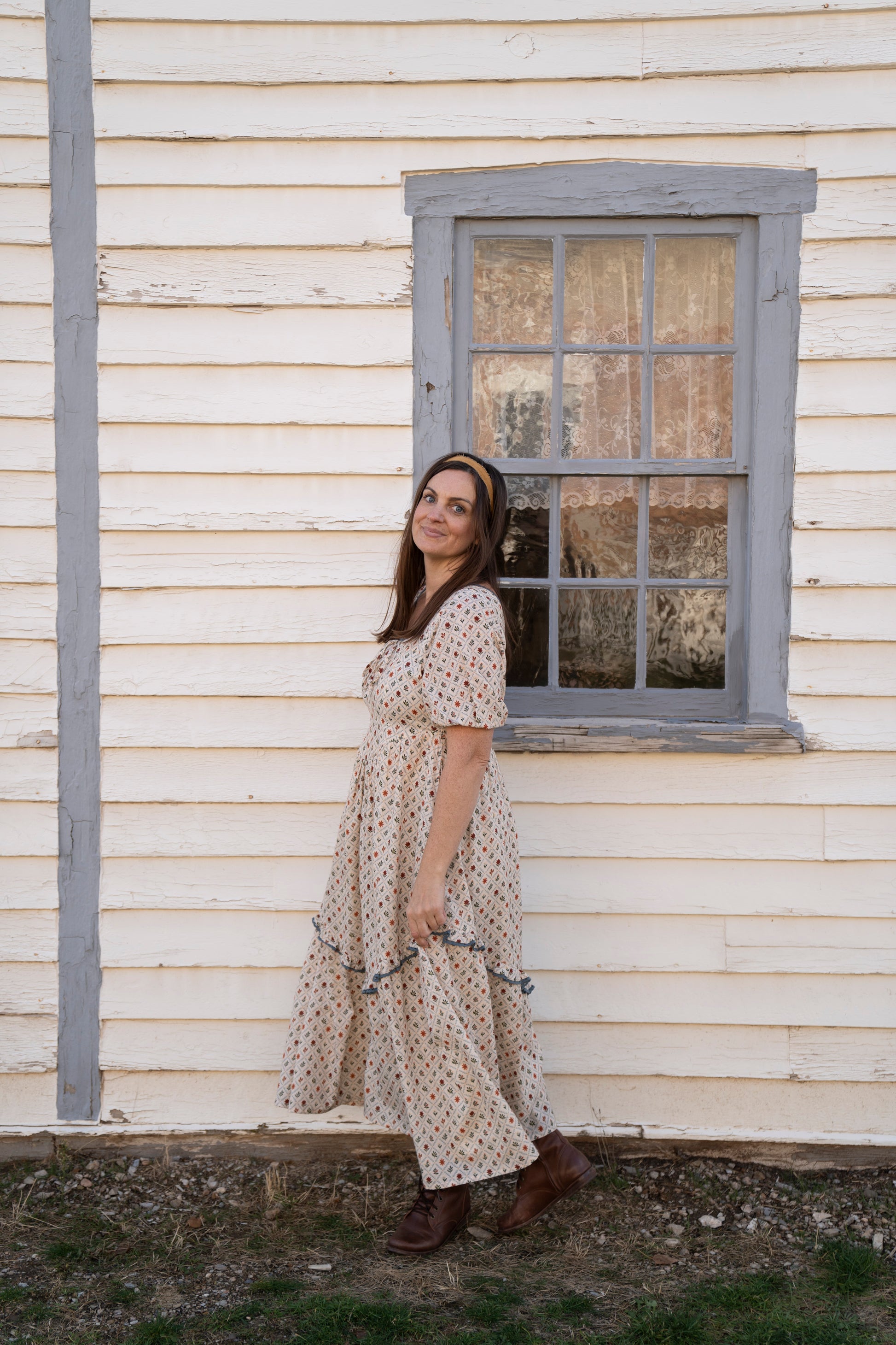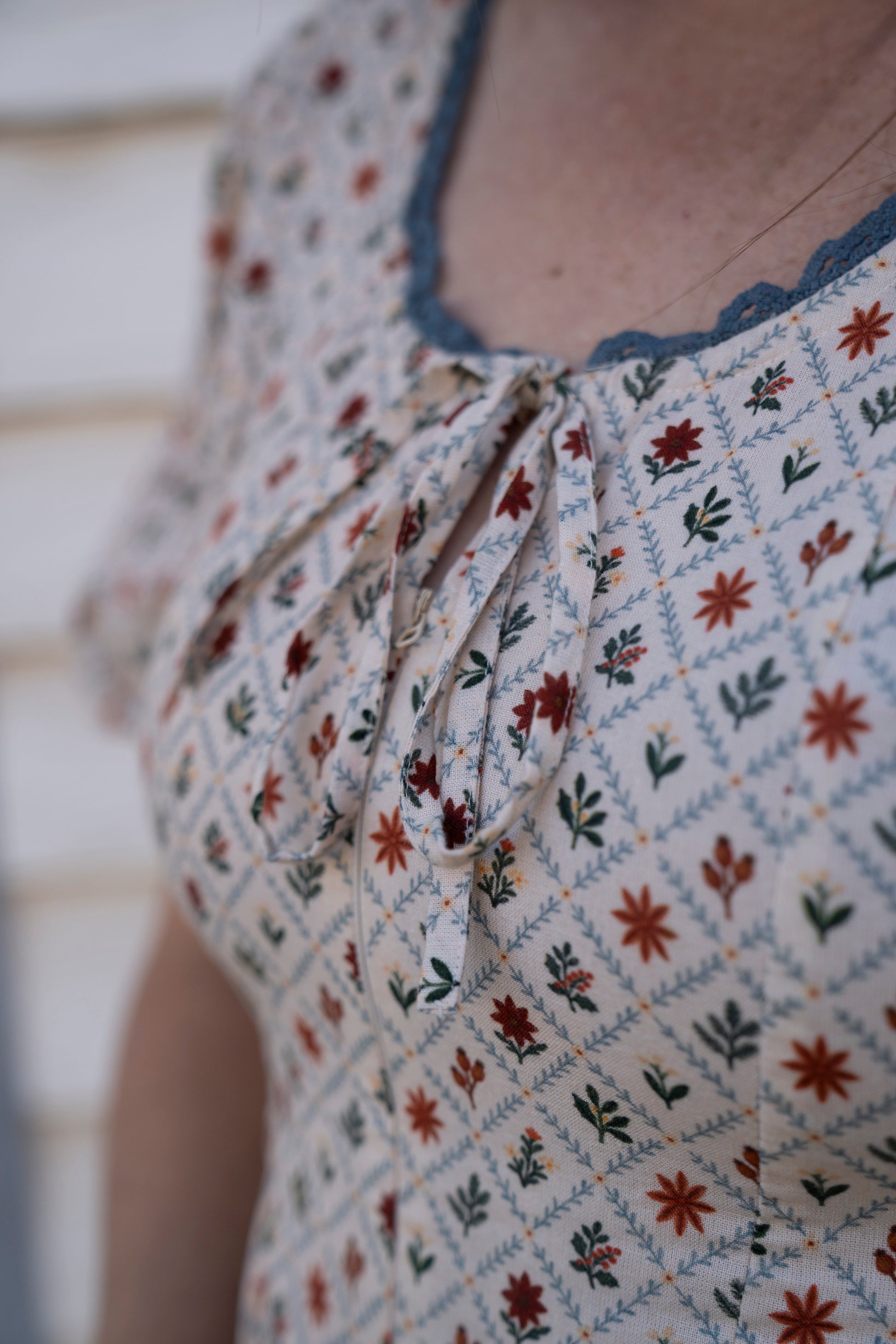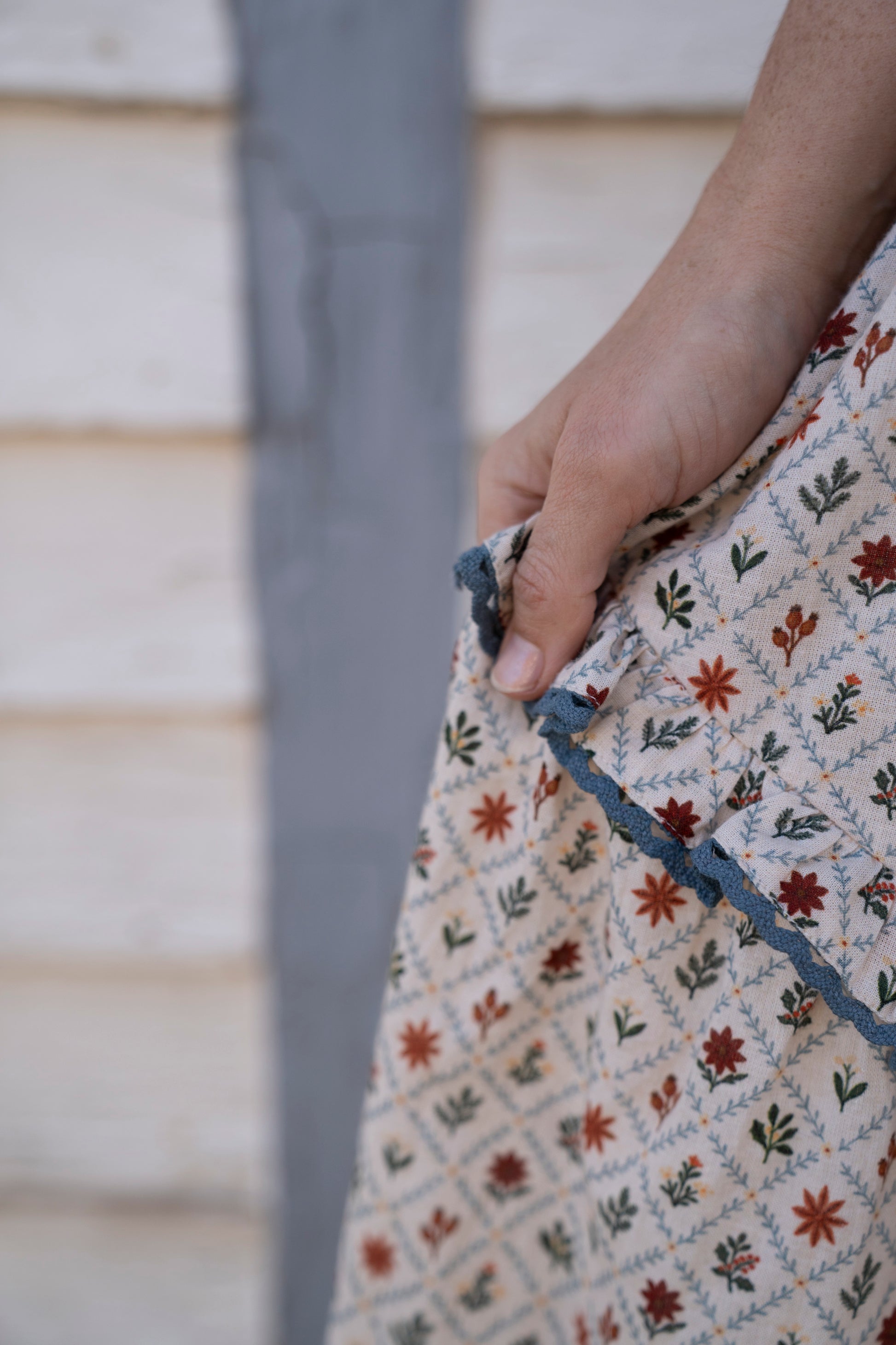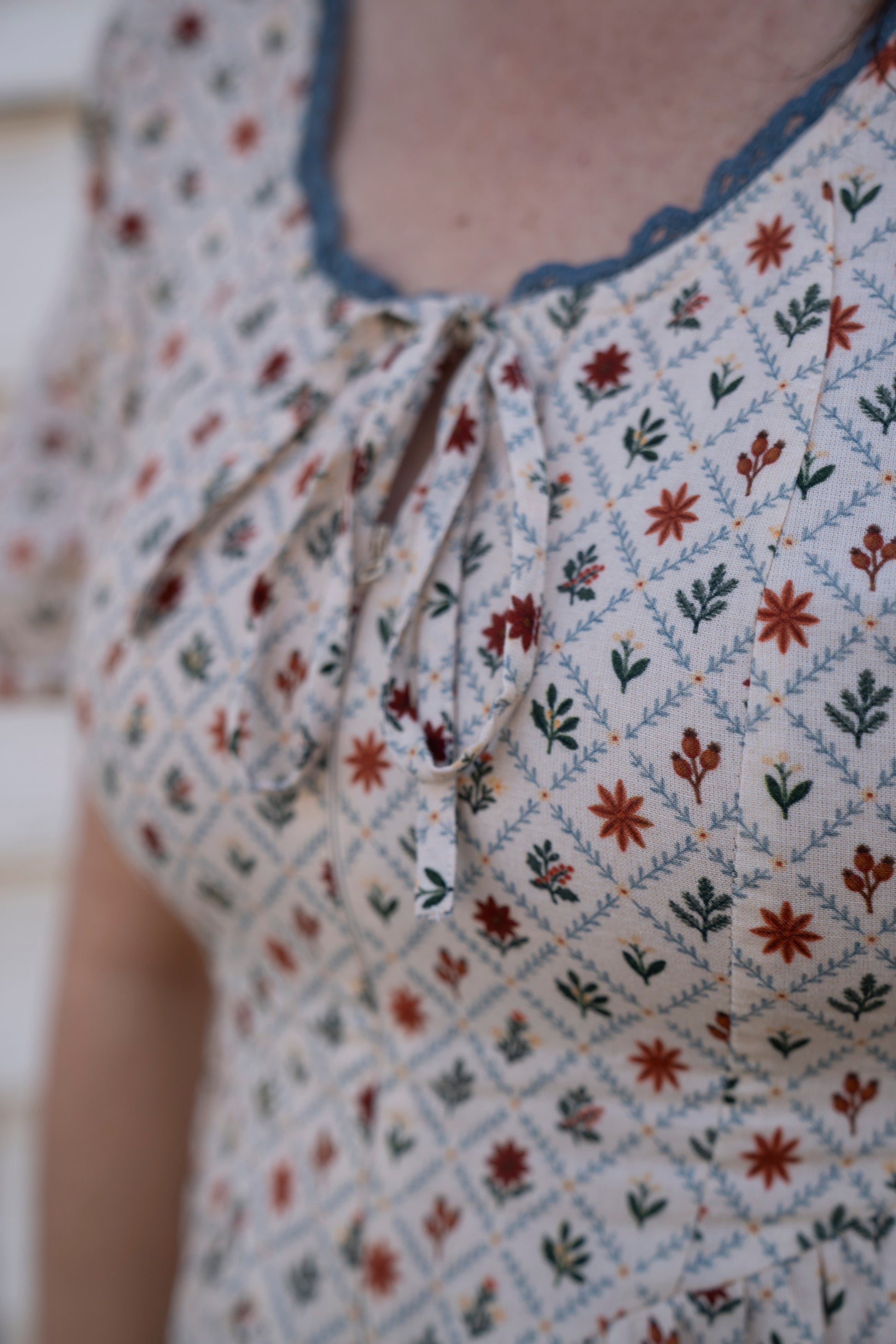 Thoughtfully designed for beauty and practicality, the Wisteria Dress is made from a soft 100% cotton outer with a smooth cotton lining for everyday comfort. This silhouette features a gentle V-shaped waistline, soft gathers, v shaped tier trimmed in dusty blue. Sweet, nostalgic, and unmistakably Little Cottonwood.